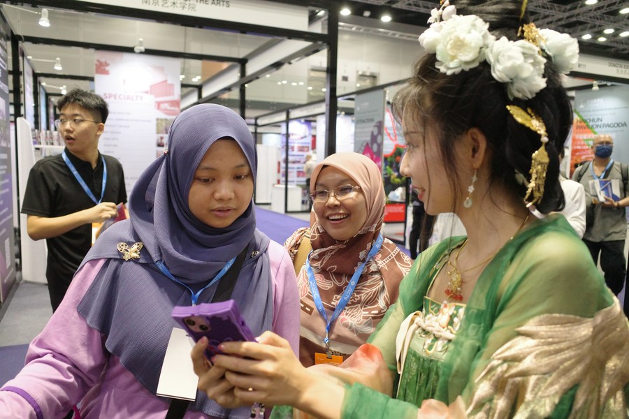 Visitors view exhibits at the China Jiangsu Culture Trade Expo 2023 in Kuala Lumpur, Malaysia, Nov. 17, 2023. (Xinhua/Cheng Yiheng)