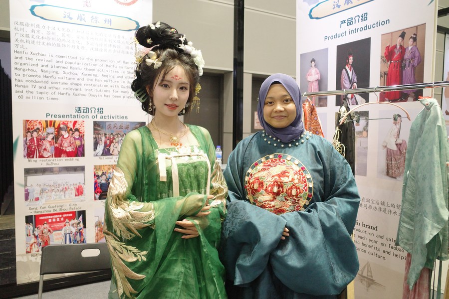 A Chinese exhibitor introduces Hanfu, a type of traditional Chinese garment, to visitors at the China Jiangsu Culture Trade Expo 2023 in Kuala Lumpur, Malaysia, Nov. 17, 2023. (Xinhua/Cheng Yiheng)?