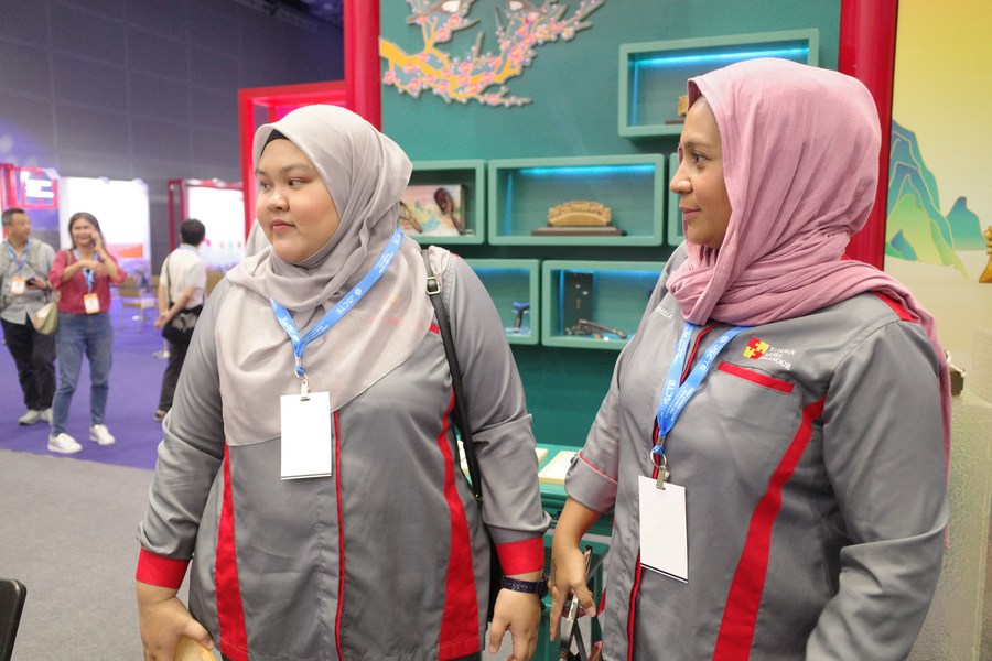 A Malaysian woman (R) and a Chinese exhibitor pose for photos at the China Jiangsu Culture Trade Expo 2023 in Kuala Lumpur, Malaysia, Nov. 17, 2023. (Xinhua/Cheng Yiheng)