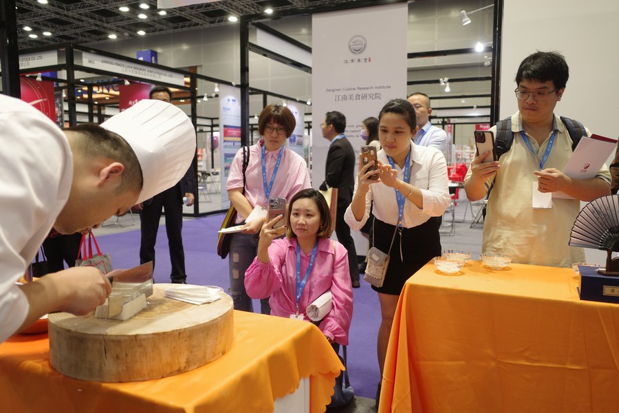 Visitors watch and record as a chef makes Chinese food at the China Jiangsu Culture Trade Expo 2023 in Kuala Lumpur, Malaysia, Nov. 17, 2023. (Xinhua/Cheng Yiheng)