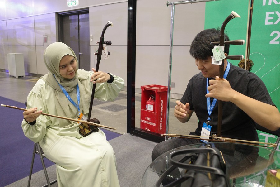 A Malaysian woman (R) plays Erhu with a Chinese exhibitor at the China Jiangsu Culture Trade Expo 2023 in Kuala Lumpur, Malaysia, Nov. 17, 2023. (Xinhua/Cheng Yiheng)