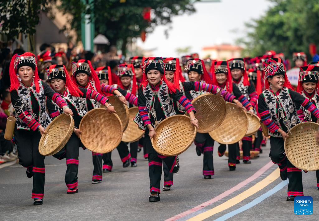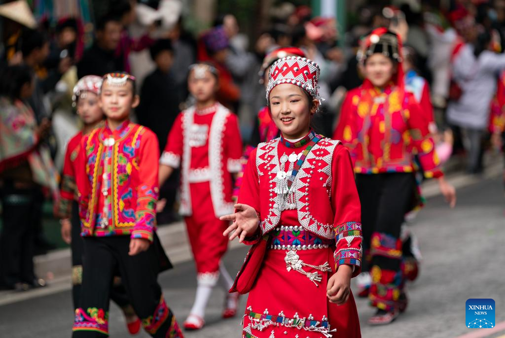 Local residents of Hani ethnic group attend a parade during a cultural tourism festival in Luchun County of Honghe Hani and Yi Autonomous Prefecture, southwest China's Yunnan Province, Nov. 19, 2023. The long street banquet, a time-honoured tradition of Hani ethnic group in China, was held here during a cultural tourism festival on Sunday. (Xinhua/Chen Xinbo)