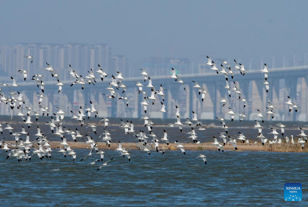 Avocets fly in the Quanzhou Bay estuary wetland in southeast China's Fujian Province, Nov. 18, 2023. (Xinhua/Wei Peiquan)