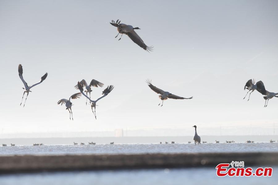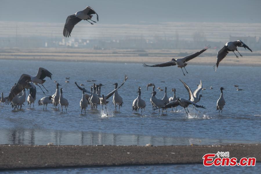 Black-necked cranes forage and play at a protection zone in Linzhou County, northern Lhasa, Southwest China's Tibet Autonomous Region, Nov. 19, 2023.(Photo/China News Service)