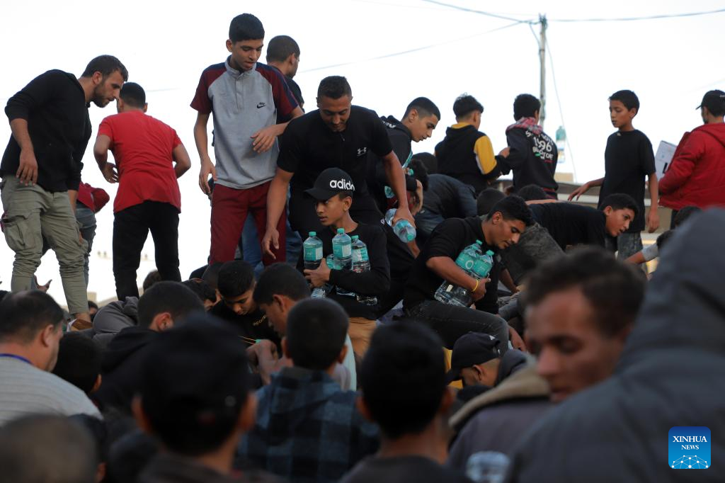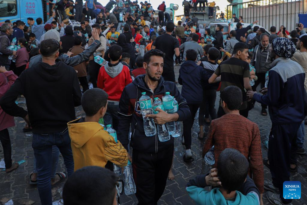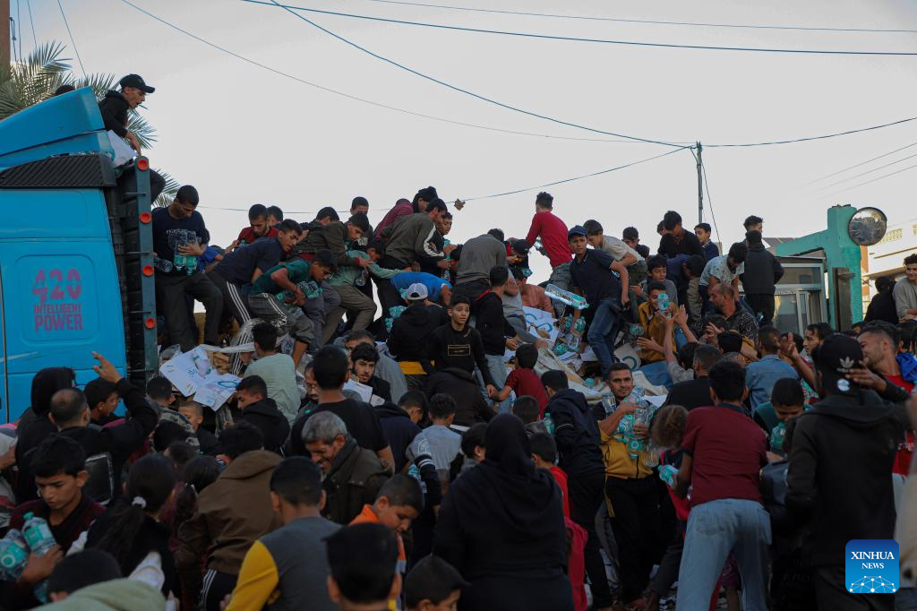 Palestinian people get drinking water from trucks loaded with food supplies in the southern Gaza Strip city of Khan Younis, on Nov. 21, 2023. The Palestinian death toll in the Gaza Strip has surpassed 14,000 since the current Israel-Hamas conflict broke out on Oct. 7, the Hamas-run government media office said Tuesday. (Photo by Rizek Abdeljawad/Xinhua)