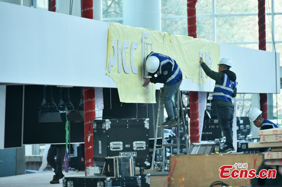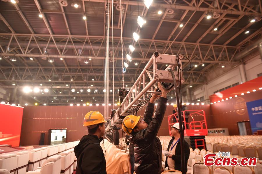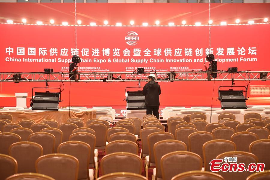 Workers make preparations for the first China International Supply Chain Expo (CISCE) at China Exhibition Center in Shunyi, Beijing, Nov. 21. 2023. (Photo: China News Network/Li Jun)