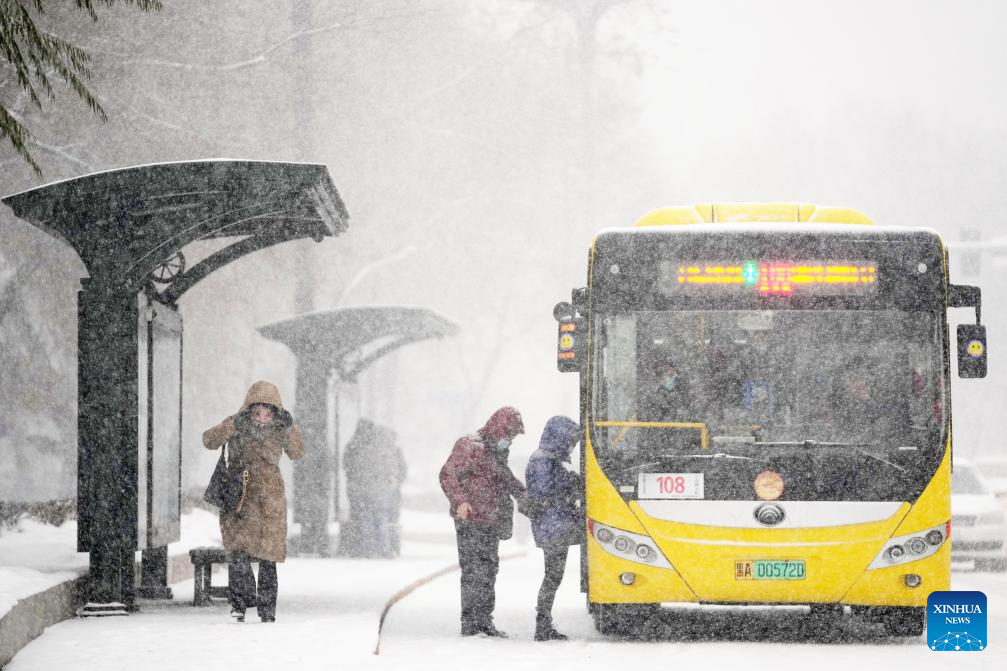 People wait for buses in the snow in Harbin, capital of northeast China's Heilongjiang Province, Nov. 22, 2023. (Xinhua/Wang Jianwei)