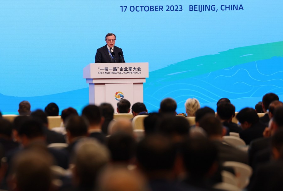 Jose Vinals, chairman of Standard Chartered Group, delivers a speech at the Belt and Road CEO Conference in Beijing, capital of China, Oct. 17, 2023. (Xinhua/Chen Bin)
