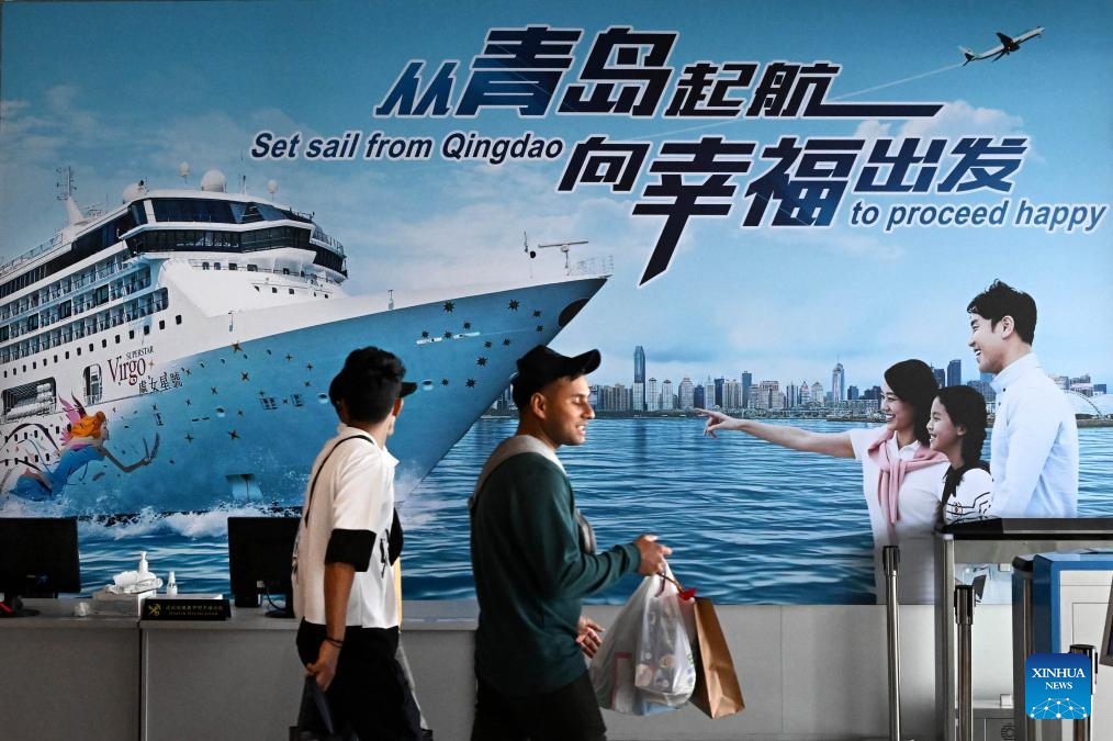 People walk past a billboard at the passenger transportation center of Qingdao Cruise Terminal in Qingdao, east China's Shandong Province, Nov. 21, 2023. Qingdao has been vigorously developing its cruise tourism service. As cruise voyages become increasingly frequent along with a climbing number of inbound tourists, they also contribute to the sustainable development of related sectors in the city. To date, Qingdao is connected by 40 international cruise lines to nearly 20 port cities. (Xinhua/Li Ziheng)