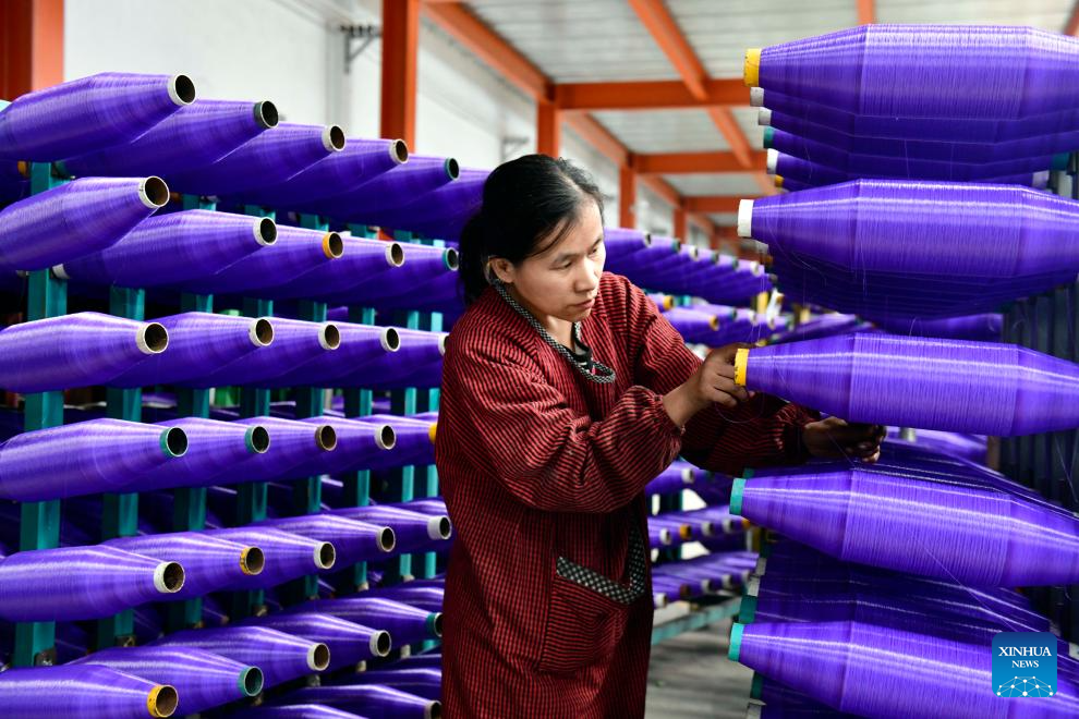 A worker arranges reels of thread at a workshop of an enterprise in Lizhuang Town of Huimin County, east China's Shandong Province, Nov. 22, 2023. Huimin has more than 1,300 enterprises producing net and rope products, which are widely used in construction, sports and other industries. From January to October this year, this industry in Huimin has achieved an output value of over 21.7 billion yuan (about 3.03 billion U.S. dollars). (Xinhua/Guo Xulei)