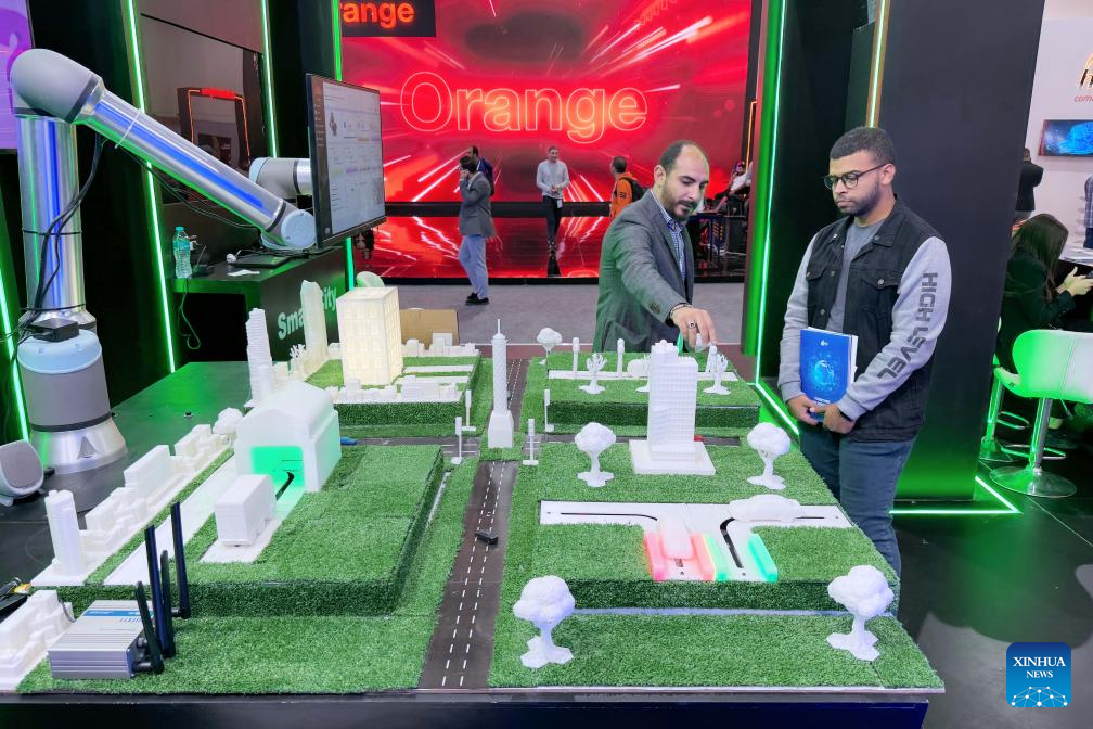 People look at a model at the Cairo ICT 2023 expo in Cairo, Egypt, on Nov. 21, 2023. Egypt has hosted the 27th edition of Cairo ICT 2023 expo, the country's largest information and communications technology (ICT) exhibition, as the north African country seeks to facilitate a digital transformation via clinching win-win business deals. (Xinhua/Ahmed Gomaa)
