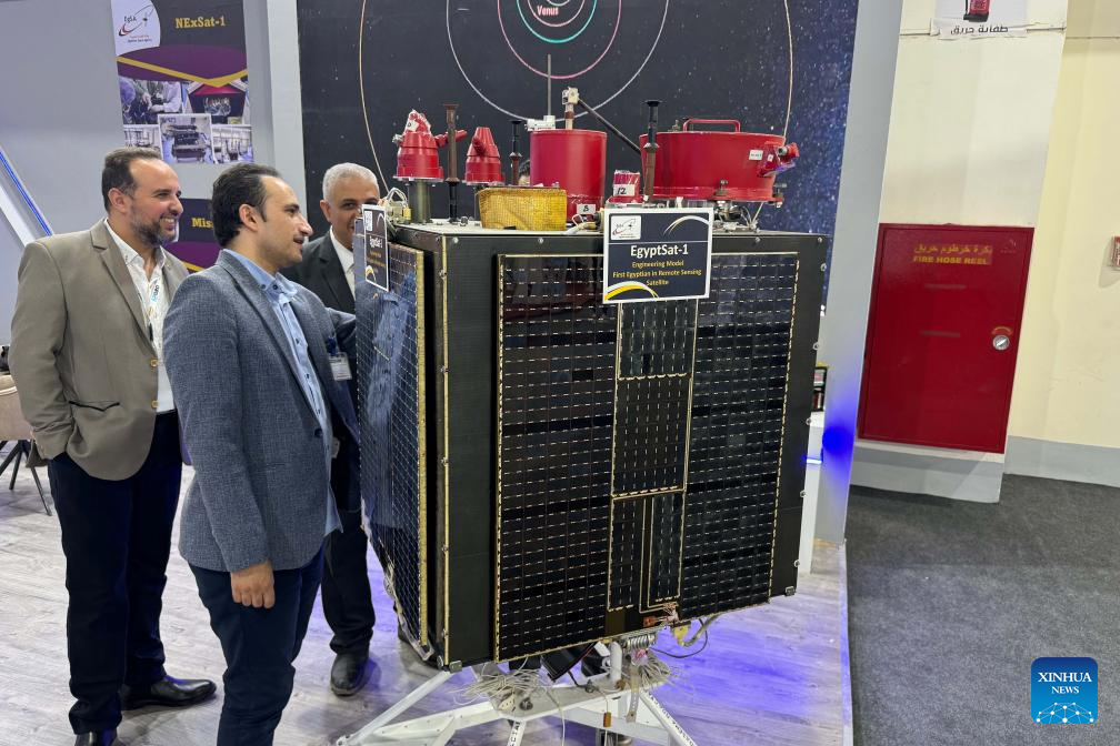 People view a satellite model at the Cairo ICT 2023 expo in Cairo, Egypt, on Nov. 21, 2023. Egypt has hosted the 27th edition of Cairo ICT 2023 expo, the country's largest information and communications technology (ICT) exhibition, as the north African country seeks to facilitate a digital transformation via clinching win-win business deals. (Xinhua/Ahmed Gomaa)