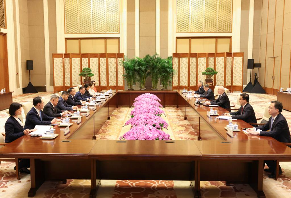 Cai Qi, a member of the Standing Committee of the Political Bureau of the Communist Party of China (CPC) Central Committee and a member of the Secretariat of the CPC Central Committee, meets with a delegation led by Dashzegve Amarbayasgalan, secretary general of the Mongolian People's Party, in Beijing, capital of China, Nov. 22, 2023. (Xinhua/Pang Xinglei)