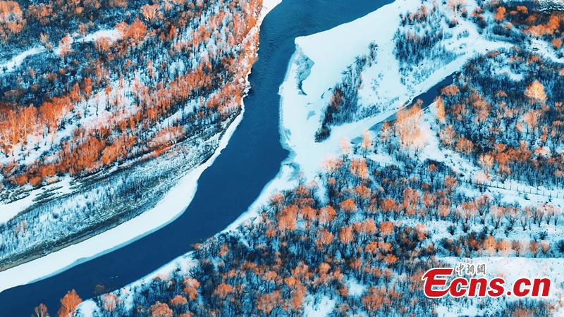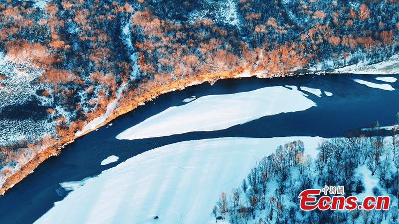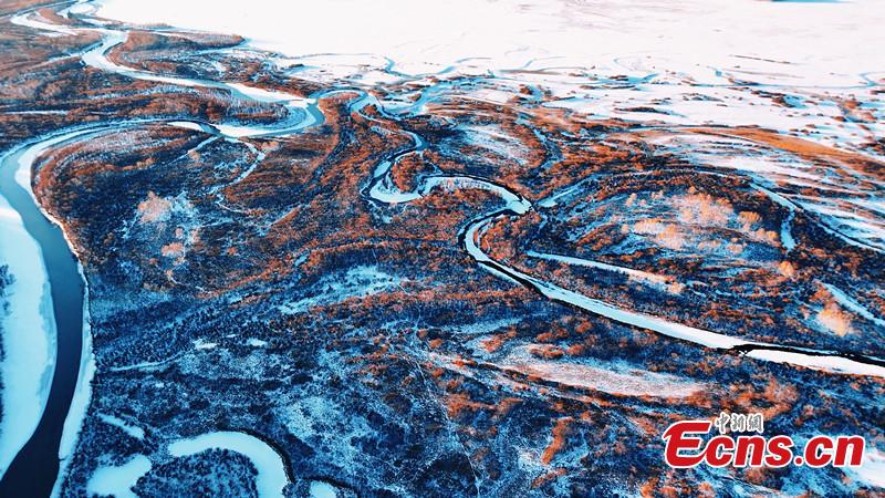 Snow flowing in winding river forms a white belt at Erguna wetland in north China's Inner Mongolia Autonomous Region. (Photo: China News Service/Wang Zhuo)