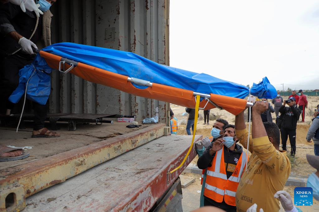 Palestinian workers transfer a body as they establish a mass grave for the victims inside and north of Gaza City, in the southern Gaza Strip city of Khan Younis, on Nov. 22, 2023. The Palestinian death toll in the Gaza Strip has risen to 14,532 since the outbreak of the Hamas-Israel conflict on Oct. 7, the Hamas-run government media office said Wednesday. (Photo by Rizek Abdeljawad/Xinhua)