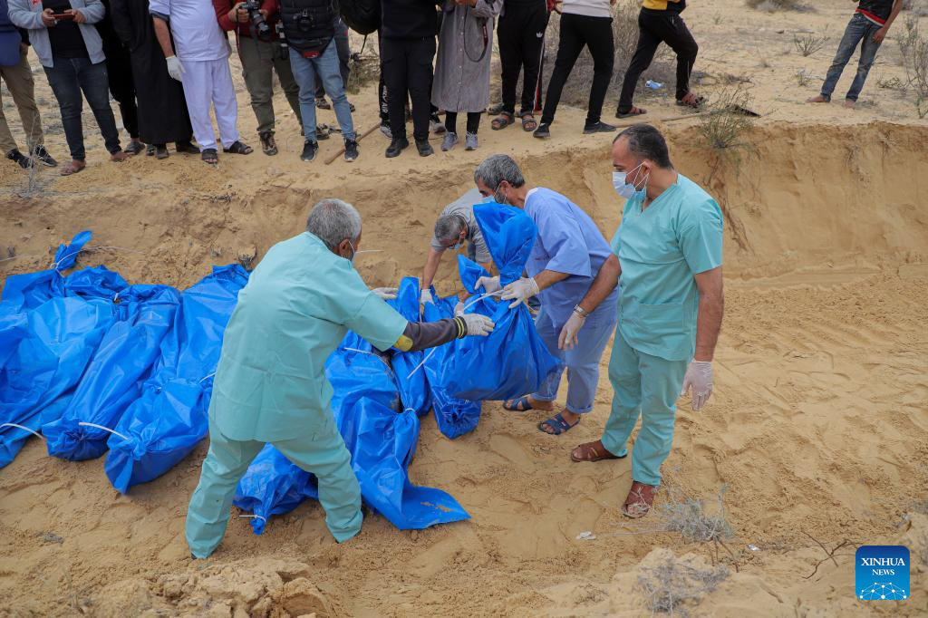 Palestinian workers establish a mass grave for the victims inside and north of Gaza City, in the southern Gaza Strip city of Khan Younis, on Nov. 22, 2023. The Palestinian death toll in the Gaza Strip has risen to 14,532 since the outbreak of the Hamas-Israel conflict on Oct. 7, the Hamas-run government media office said Wednesday. (Photo by Rizek Abdeljawad/Xinhua)