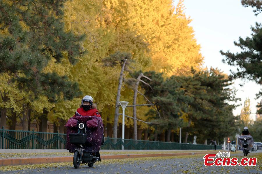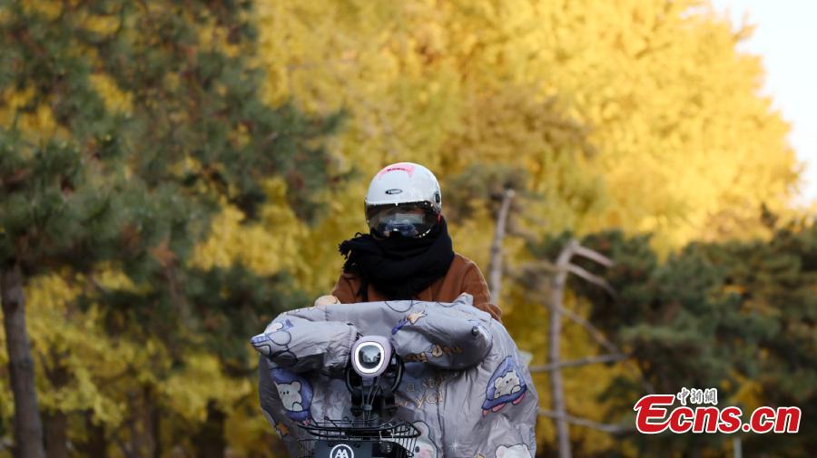 A resident wearing heavy clothing rides an electric bike on a road amid strong wind in Beijing, Nov. 23, 2023. (Photo: China News Service/Sheng Jiapeng)