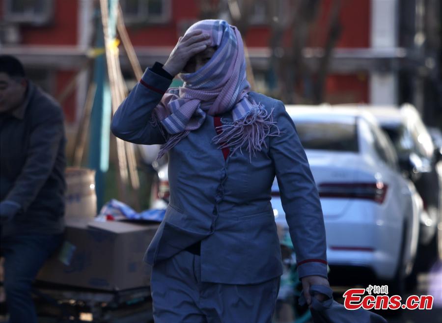 A cold front ushered in strong winds on Thursday in Beijing, causing a steep drop in the temperature.
