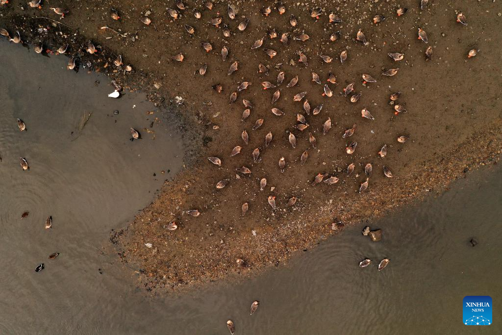 This aerial photo taken on Nov. 23, 2023 shows migratory birds at the Hunhe River in Shenyang, northeast China's Liaoning Province. (Xinhua/Yao Jianfeng)