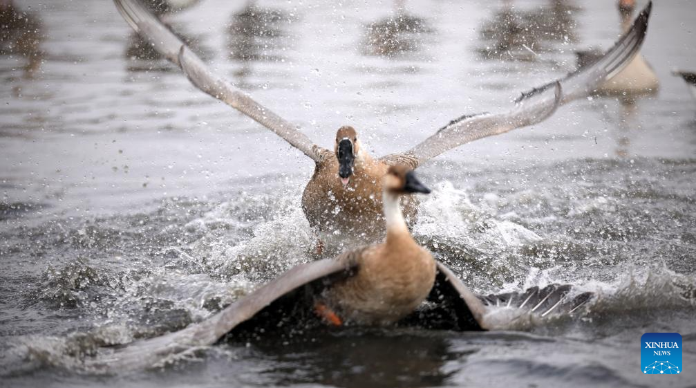 This photo taken on Nov. 23, 2023 shows migratory birds swimming in the Hunhe River in Shenyang, northeast China's Liaoning Province. (Xinhua/Yao Jianfeng)