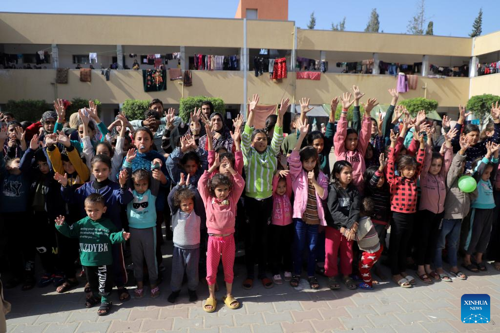 Children take part in a psychological stimulation and relief activity at a school affiliated to the United Nations Relief and Works Agency for Palestine Refugees (UNRWA) in the southern Gaza Strip city of Khan Younis, Nov. 23, 2023. (Photo by Rizek Abdeljawad/Xinhua)