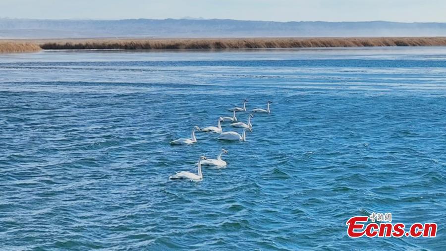 Whooper swans, under China's second-class state protection, swim in a lake surrounded by a desert, transforming it to a "Swan Lake" scene in Ulan county, Haixi Mongol and Tibetan Autonomous Prefecture, northwest China's Qinghai Province. (Photo provided to China News Service)
