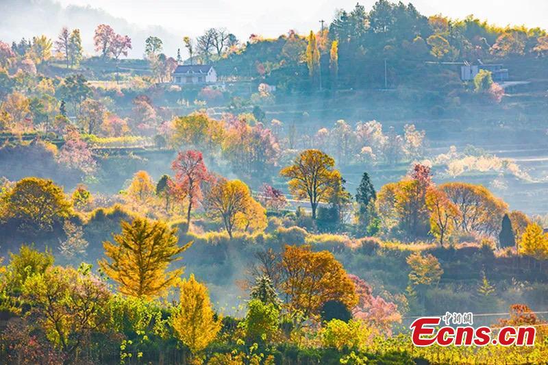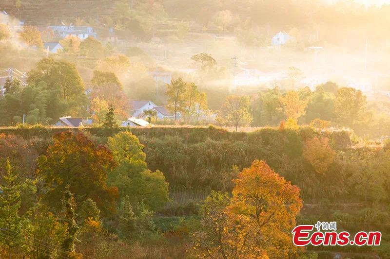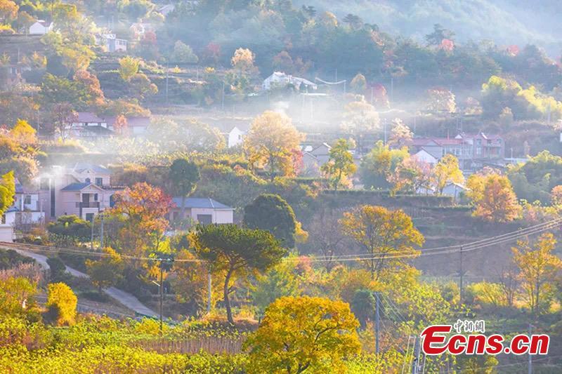 Houses and colorful trees hidden in early winter mist create an atmospheric scene in Yuexi County of Anqing City, east China's Anhui Province. (Photo: China News Service/Jiang Kejian)
