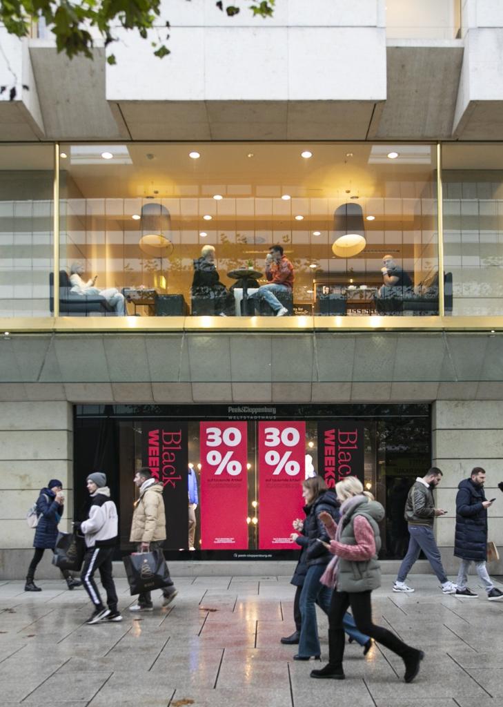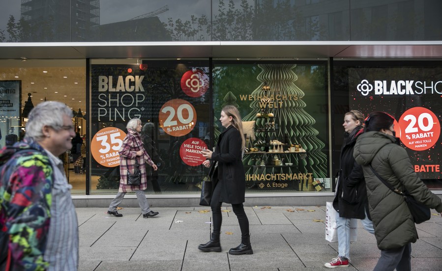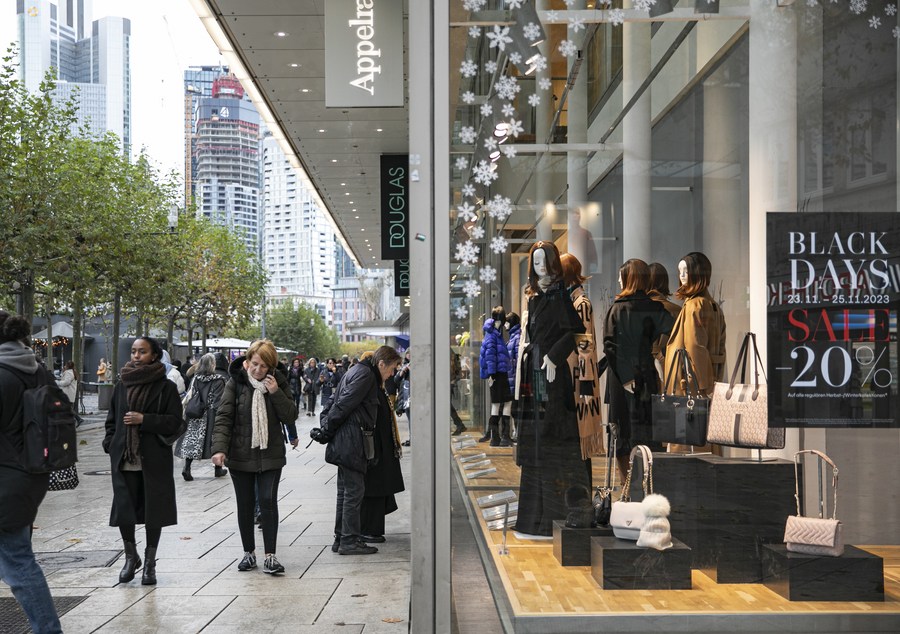 People walk past a shop during Black Friday sales in Frankfurt, Germany, Nov. 24, 2023. (Xinhua/Zhang Fan)