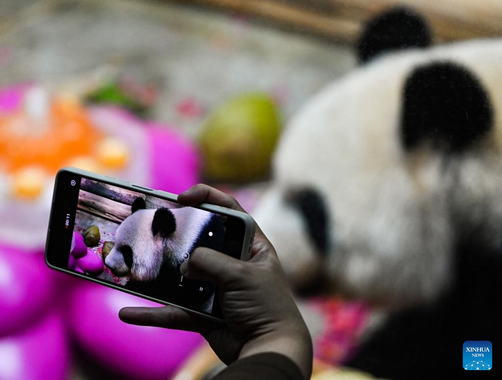 A visitor takes photos of giant panda Gonggong at the Hainan Tropical Wildlife Park and Botanical Garden in Haikou, south China's Hainan Province, Nov. 25, 2023. Giant pandas Gonggong and Shunshun have lived in Hainan for five years since they made their public debut at the Hainan Tropical Wildlife Park and Botanical Garden in 2018. A celebration ceremony was held here on Saturday, attracting lots of visitors. (Xinhua/Fan Yuqing)