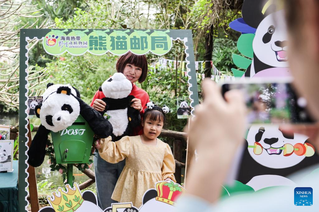 A child poses for photos at the Hainan Tropical Wildlife Park and Botanical Garden in Haikou, south China's Hainan Province, Nov. 25, 2023. Giant pandas Gonggong and Shunshun have lived in Hainan for five years since they made their public debut at the Hainan Tropical Wildlife Park and Botanical Garden in 2018. A celebration ceremony was held here on Saturday, attracting lots of visitors. (Xinhua/Fan Yuqing)