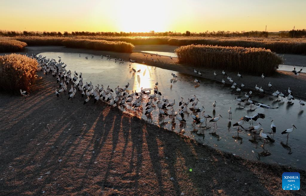 This aerial photo taken on Nov. 25, 2023 shows a flock of oriental white storks foraging at a wetland in Fengnan District of Tangshan, north China's Hebei Province. Coastal wetlands in the city of Tangshan are important habitats for migratory birds. (Xinhua/Yang Shiyao)