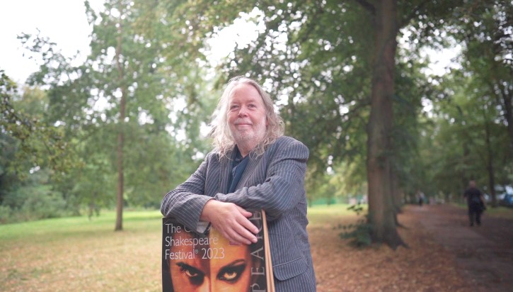 Dr. David Crilly with a poster of the 2023 Cambridge Shakespeare Festival (Photo/Jedrek Koh)