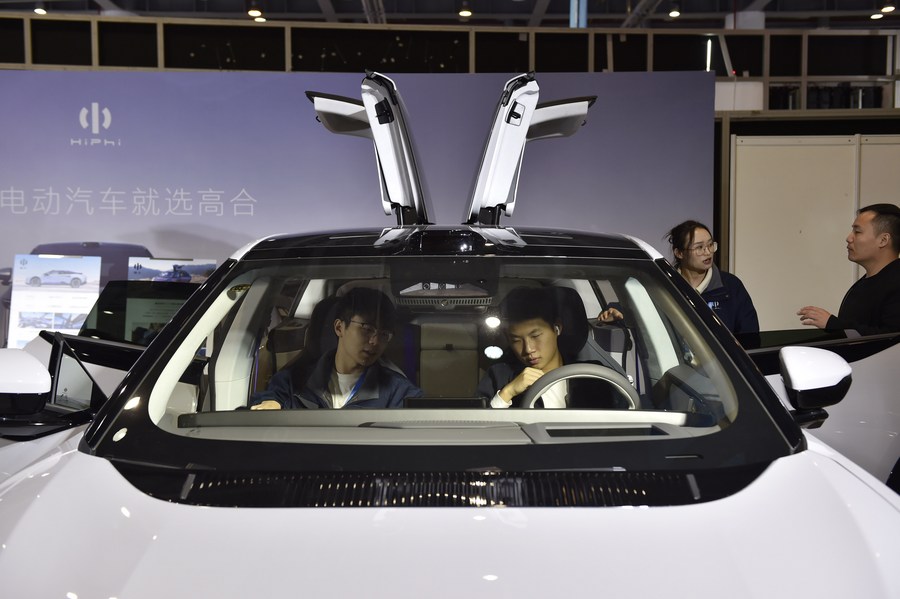 Visitors experience an electric car at the second Global Digital Trade Expo in Hangzhou, east China's Zhejiang Province, Nov. 24, 2023. (Xinhua/Liu Lingyi)
