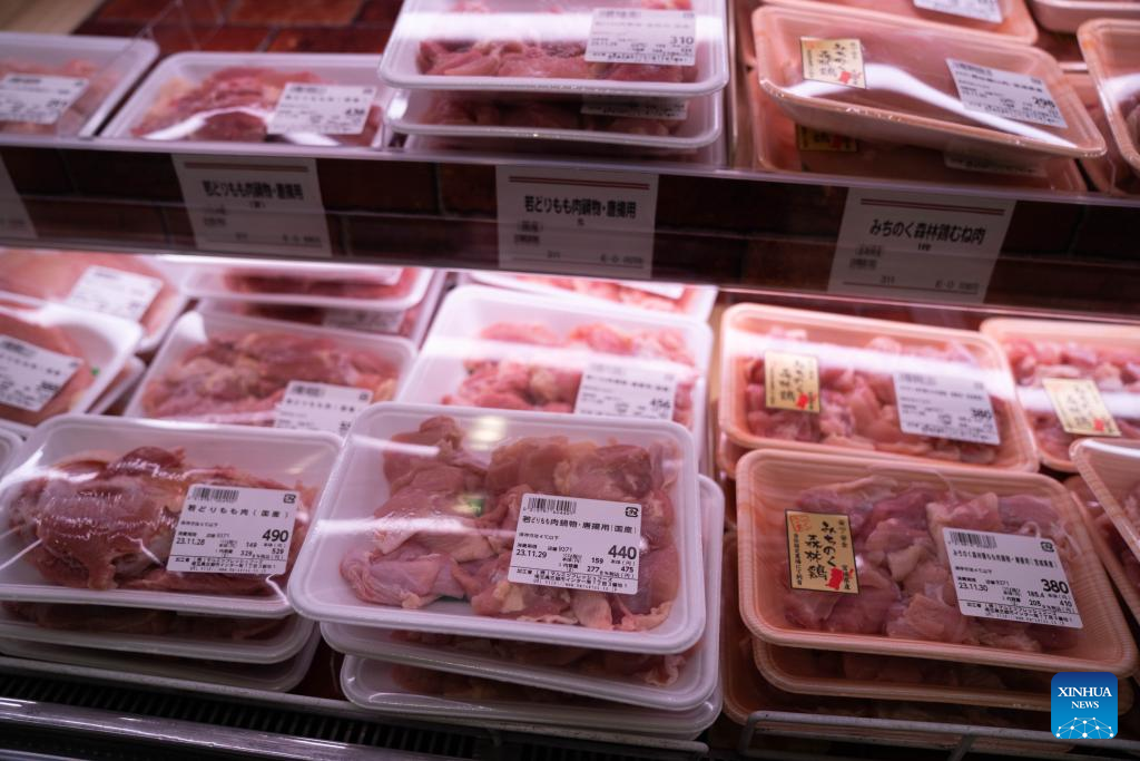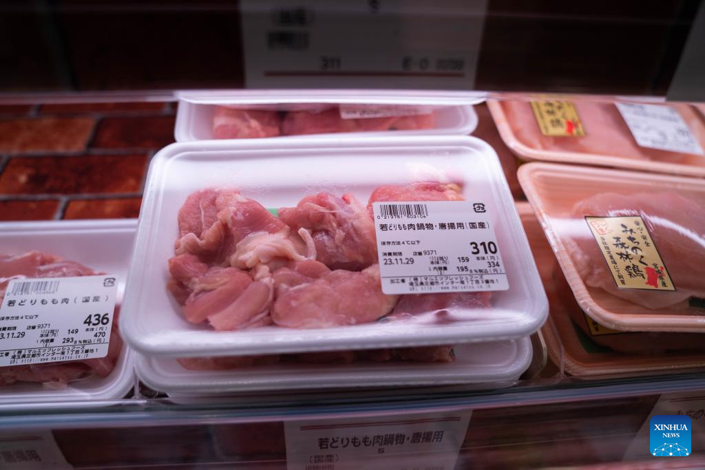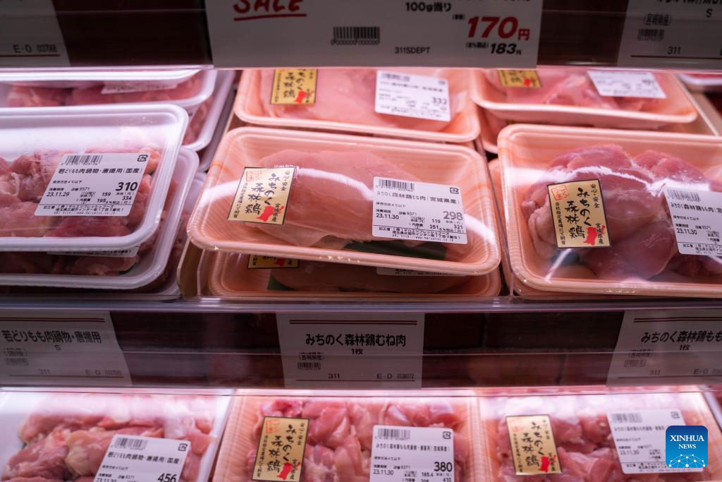 Packaged chicken are pictured at a supermarket in Tokyo, Japan, Nov. 27, 2023. An outbreak of highly pathogenic avian influenza at a poultry farm in Japan's eastern prefecture of Ibaraki has been confirmed, the farm ministry said on Monday, marking the second bird flu outbreak in the country this season. (Xinhua/Zhang Xiaoyu)