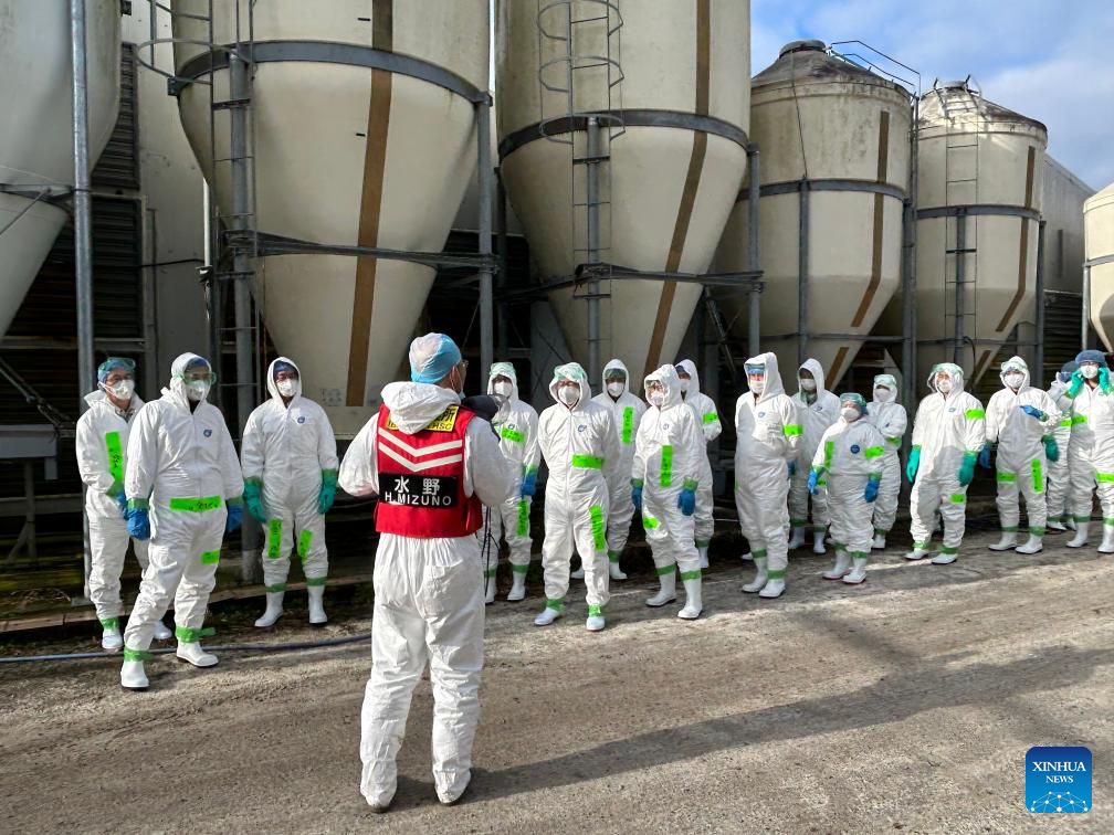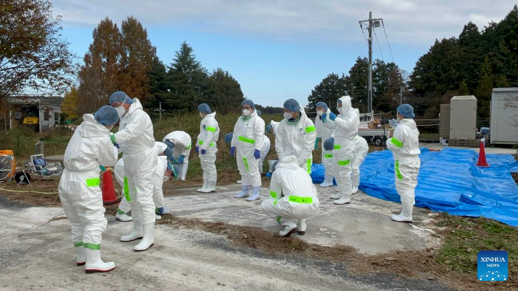 Staff workers perform a disinfecting operation in Kasama, Ibaraki prefecture, Japan, Nov. 27, 2023. An outbreak of highly pathogenic avian influenza at a poultry farm in Japan's eastern prefecture of Ibaraki has been confirmed, the farm ministry said on Monday, marking the second bird flu outbreak in the country this season. (Xinhua)