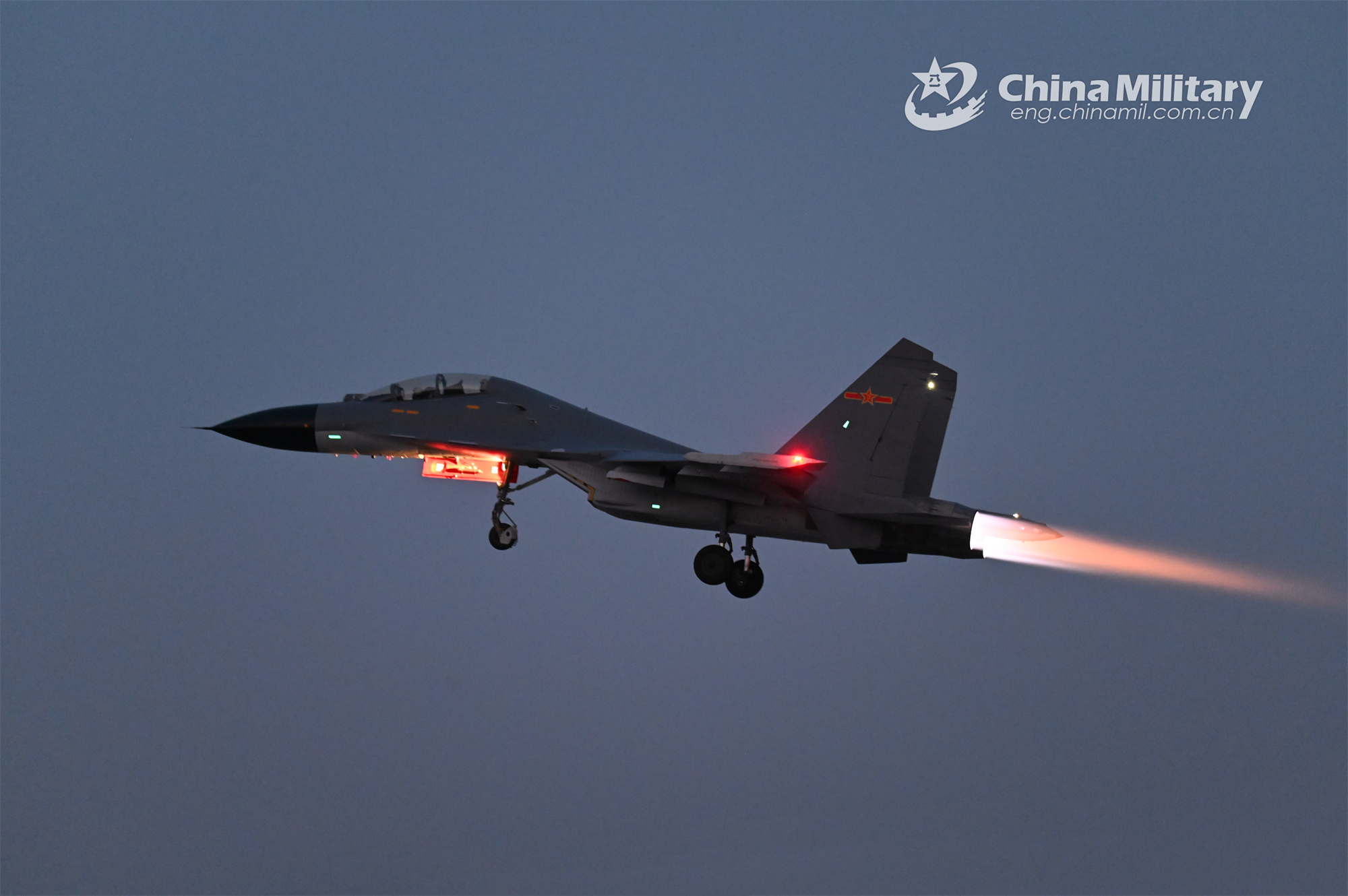 A fighter jet attached to an aviation brigade with the air force under the PLA Western Theater Command takes off in full power during an around-the-clock flight training exercise on November 20, 2023. (eng.chinamil.com.cn/Photo by Yu Zeqi)