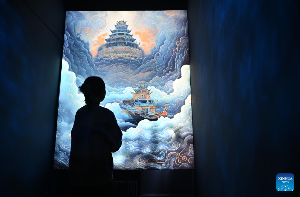 A visitor views a painting at an exhibition themed on Dunhuang culture at the Tianjin Digital Art Museum in Tianjin, north China, Nov. 28, 2023. The exhibition will last until March 2024. (Xinhua/Sun Fanyue)