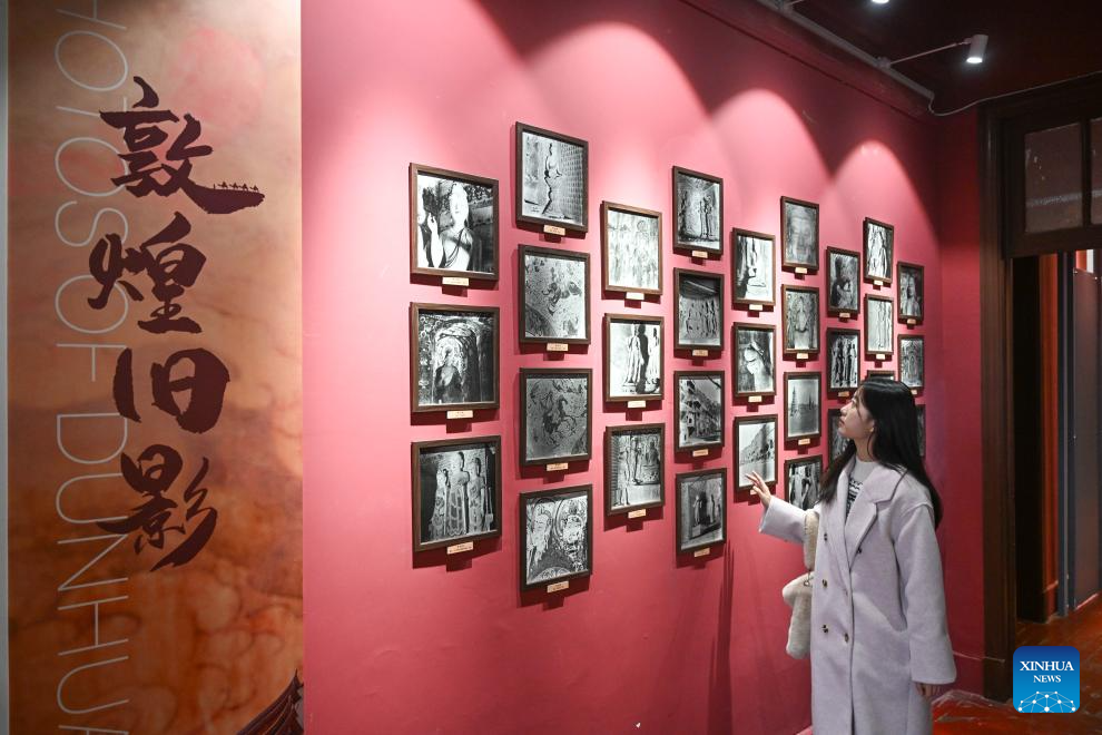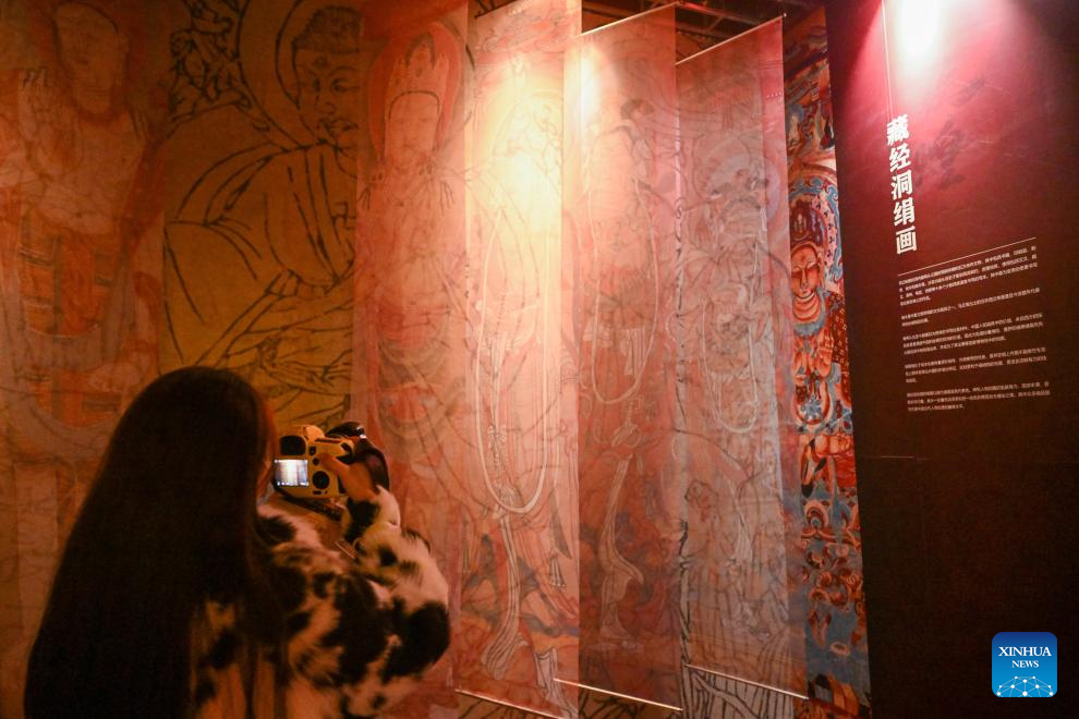 A visitor views exhibits at an exhibition themed on Dunhuang culture at the Tianjin Digital Art Museum in Tianjin, north China, Nov. 28, 2023. The exhibition will last until March 2024. (Xinhua/Sun Fanyue)