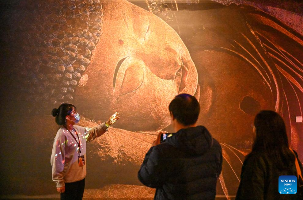A guide introduces an exhibit at an exhibition themed on Dunhuang culture at the Tianjin Digital Art Museum in Tianjin, north China, Nov. 28, 2023. The exhibition will last until March 2024. (Xinhua/Sun Fanyue)