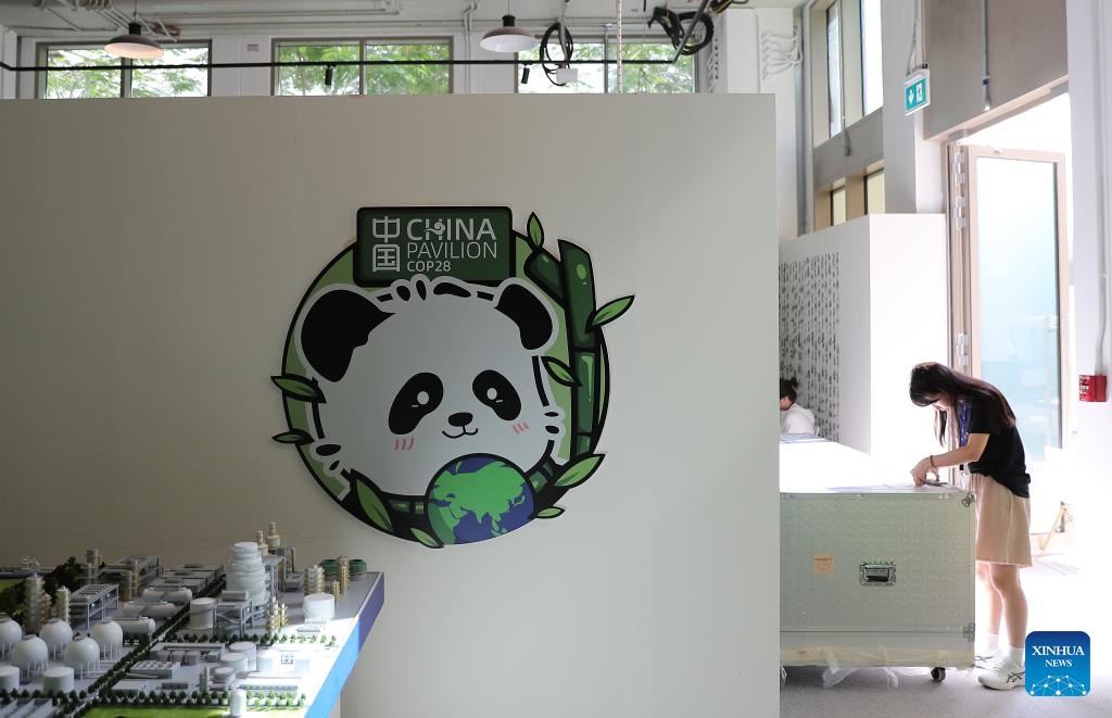 This photo taken on Nov. 29, 2023 shows the China Pavilion of COP28 in Dubai, the United Arab Emirates. COP28, which refers to the 28th session of the Conference of the Parties to the United Nations Framework Convention on Climate Change, is scheduled to be held in the Expo City of Dubai, the United Arab Emirates, from Nov. 30 to Dec. 12. (Xinhua/Wang Dongzhen)