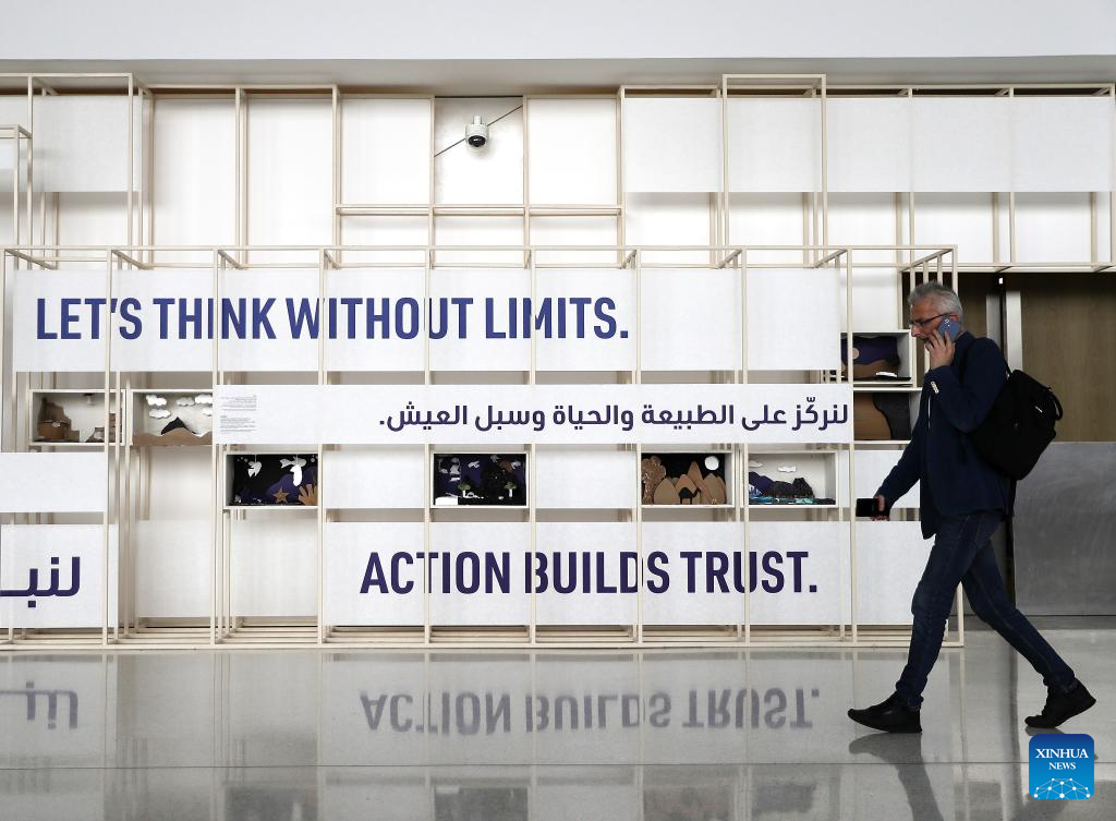 An attendee walks in the Expo City in Dubai, the United Arab Emirates, Nov. 29, 2023. COP28, which refers to the 28th session of the Conference of the Parties to the United Nations Framework Convention on Climate Change, is scheduled to be held in the Expo City of Dubai, the United Arab Emirates, from Nov. 30 to Dec. 12. (Xinhua/Wang Dongzhen)