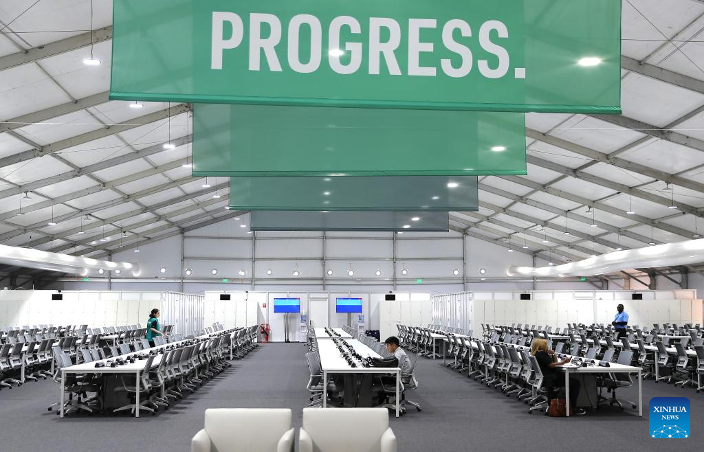 This photo taken on Nov. 29, 2023 shows the media center of COP28 in Dubai, the United Arab Emirates. COP28, which refers to the 28th session of the Conference of the Parties to the United Nations Framework Convention on Climate Change, is scheduled to be held in the Expo City of Dubai, the United Arab Emirates, from Nov. 30 to Dec. 12. (Xinhua/Wang Dongzhen)