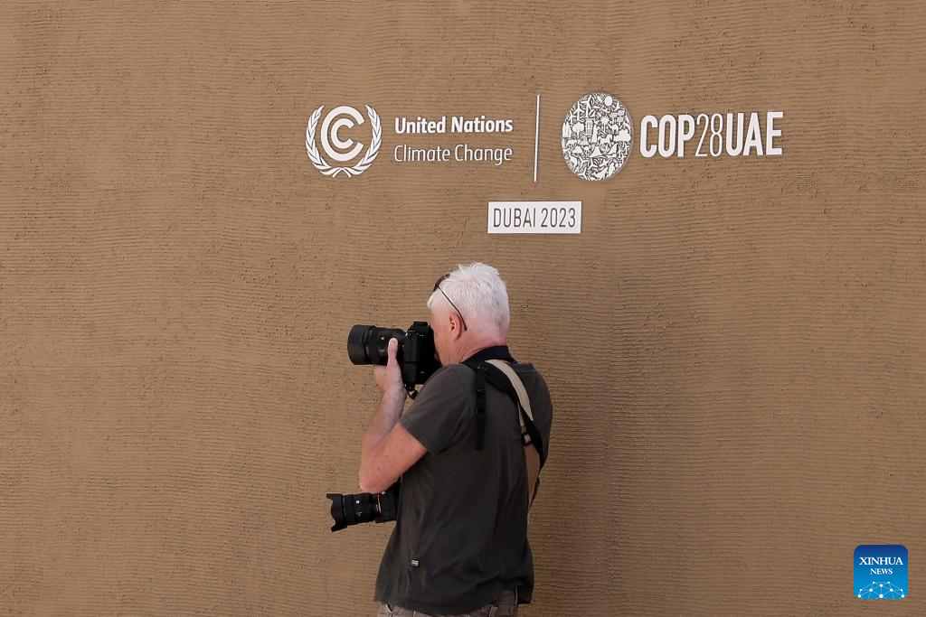 A photographer takes photos beside a logo of COP28 in Dubai, the United Arab Emirates, Nov. 29, 2023. COP28, which refers to the 28th session of the Conference of the Parties to the United Nations Framework Convention on Climate Change, is scheduled to be held in the Expo City of Dubai, the United Arab Emirates, from Nov. 30 to Dec. 12. (Xinhua/Wang Dongzhen)