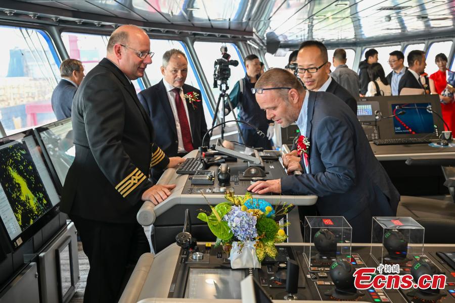 Guests visit the cockpit of the large-capacity battery hybrid propulsion and two-way navigation ro-ro passenger ship at Nansha Port in Guangzhou, south China's Guangdong Province, Nov. 29, 2023. (Photo: China News Service/Chen Jimin)