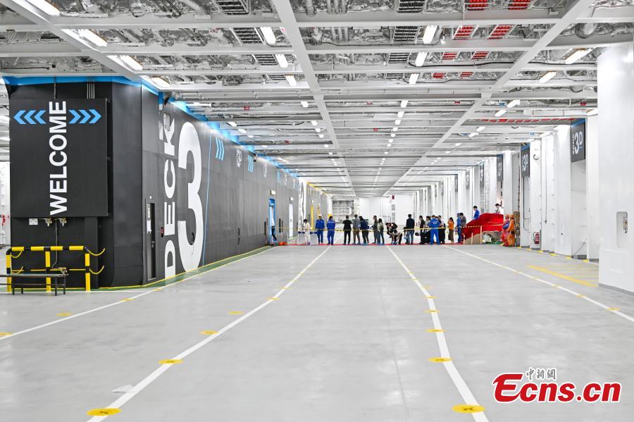 A parking garage inside the large-capacity battery hybrid propulsion and two-way navigation ro-ro passenger ship at Nansha Port in Guangzhou, south China's Guangdong Province, Nov. 29, 2023. (Photo: China News Service/Chen Jimin)