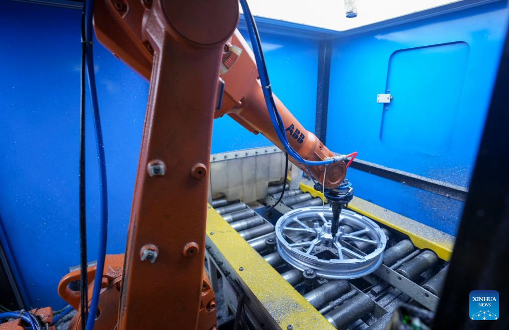 An industrial robot performs fine processing of a semi-finished wheel hub product at an automatic hub production line of a leading motorcycle wheel hub manufacturing enterprise in Dianjiang County of Chongqing, southwest China, Nov. 28, 2023. Chongqing is one of the important production and export bases of motorcycle parts in China. In recent years, Dianjiang County of Chongqing has guided local leading motorcycle wheel hub production enterprises to rely on scientific and technological innovations to promote industrial upgrading. (Xinhua/Liu Chan)