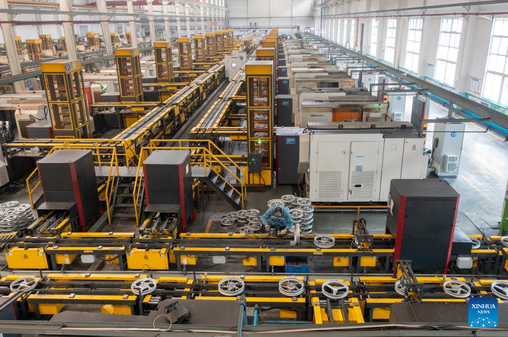 This aerial photo shows an automatic hub production line of a leading motorcycle wheel hub manufacturing enterprise in Dianjiang County of Chongqing, southwest China, Nov. 28, 2023. Chongqing is one of the important production and export bases of motorcycle parts in China. In recent years, Dianjiang County of Chongqing has guided local leading motorcycle wheel hub production enterprises to rely on scientific and technological innovations to promote industrial upgrading. (Xinhua/Liu Chan)