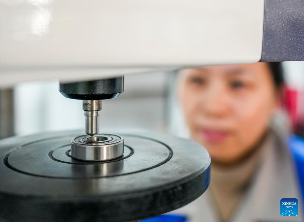 A technician uses special equipment to test hub bearings at a leading motorcycle wheel hub manufacturing enterprise in Dianjiang County of Chongqing, southwest China, Nov. 28, 2023. Chongqing is one of the important production and export bases of motorcycle parts in China. In recent years, Dianjiang County of Chongqing has guided local leading motorcycle wheel hub production enterprises to rely on scientific and technological innovations to promote industrial upgrading. (Xinhua/Liu Chan)