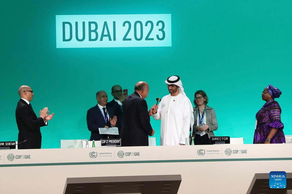 COP28 President Sultan Ahmed Al Jaber (R, front) receives a gavel from COP27 President Sameh Shoukry (L, front) during the opening ceremony of the 28th session of the Conference of the Parties to the United Nations Framework Convention on Climate Change, or COP28, in Dubai, the United Arab Emirates, Nov. 30, 2023. (Xinhua/Wang Dongzhen)