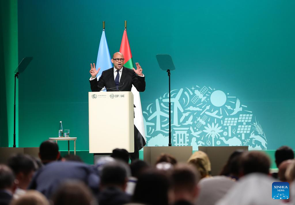 UN Climate Change Executive Secretary Simon Stiell addresses the opening ceremony of the 28th session of the Conference of the Parties to the United Nations Framework Convention on Climate Change, or COP28, in Dubai, the United Arab Emirates, Nov. 30, 2023. (Xinhua/Wang Dongzhen)